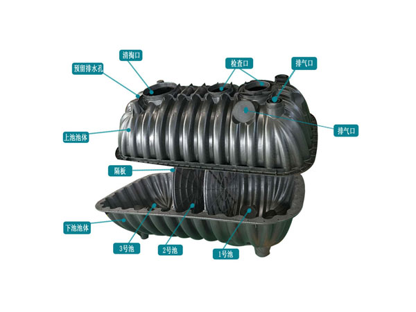 三格化糞池不僅有復雜的加強筋增加甕體承重,化糞池內(nèi)部還有兩個隔板支撐,另加一條拉桿做拉伸,進一步防止化糞池在埋地使用過程中發(fā)生變形、坍塌等情況。